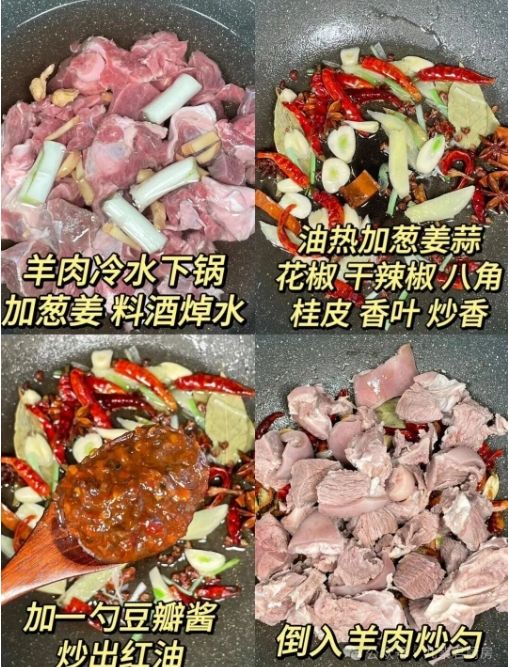 锅中热油,油热加葱姜蒜、花椒、干辣椒、八角、桂皮、香叶炒香,加入一勺豆瓣酱,炒出红油,倒入焯水好的羊肉,翻炒均匀,加入1勺生抽、1勺老抽、几粒冰糖、倒入一罐啤酒,两碗开水(水没过羊肉),盖上盖子焖煮50分钟后,揭开可以试试羊肉软烂是否合适,可以适当增加焖煮时间,开盖加适量盐和孜然粉,大火收汁就可以啦!