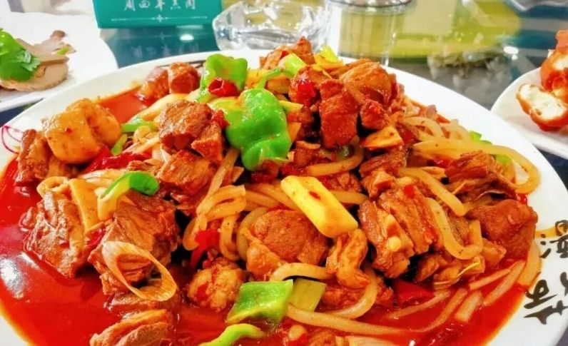 选材与烹制:精选哺乳期的羊羔肉,肉质最为细嫩。切薄片或小块,用胡麻油爆香干辣椒、葱姜蒜,随后羊肉下锅,在烈火猛灶上快速翻炒,加入粉条、青红椒等配料。调料重用花椒和辣椒,成品汤汁红亮,香气扑鼻。